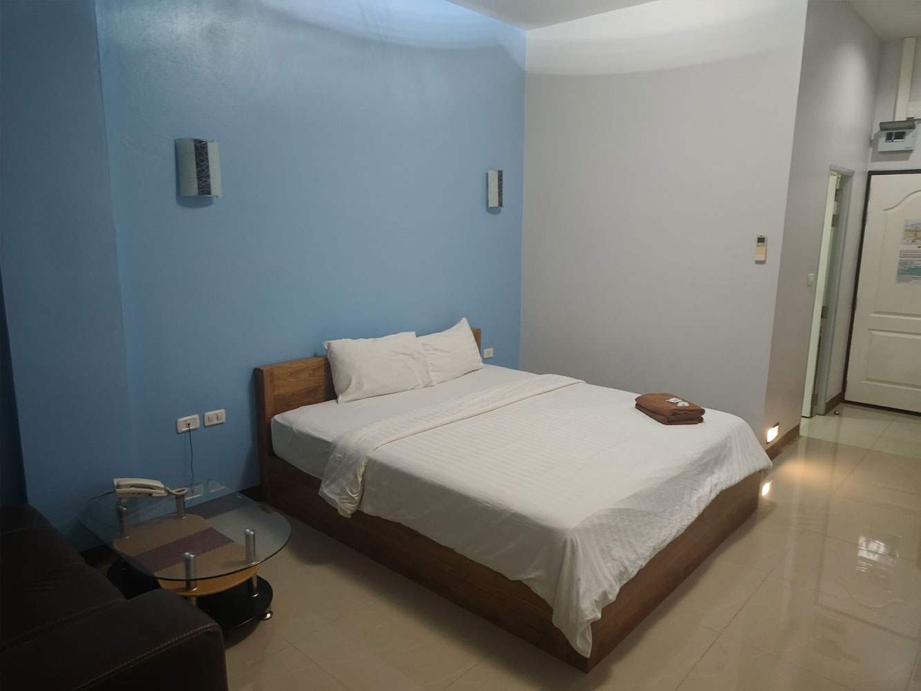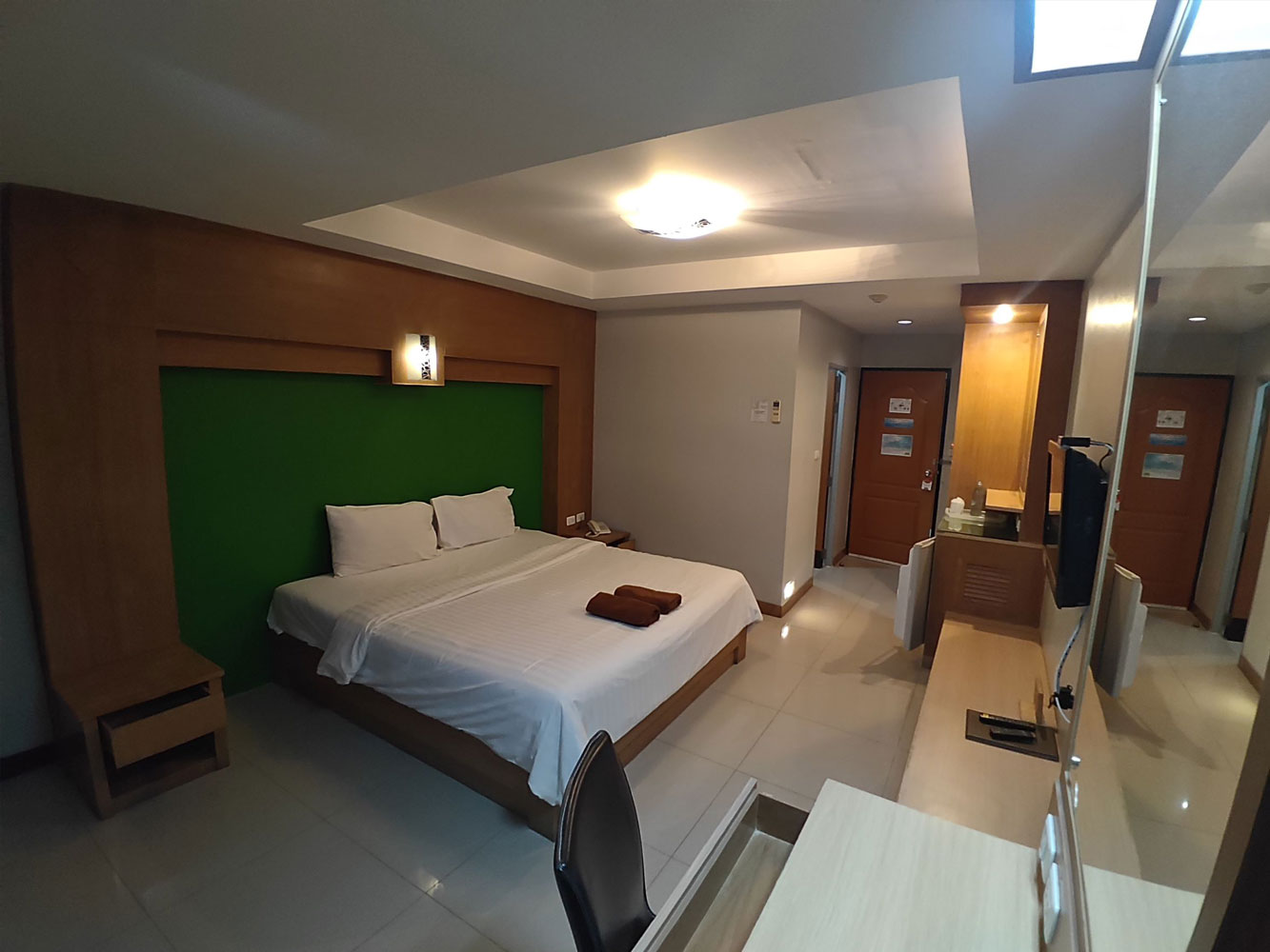 ขนาด 21 ตร.ม. เป็นห้องชั้น 1 เตียง 6 ฟุต ประกอบด้วย แอร์ เครื่องทำน้ำอุ่น ตู้เย็น ทีวี และโซฟา